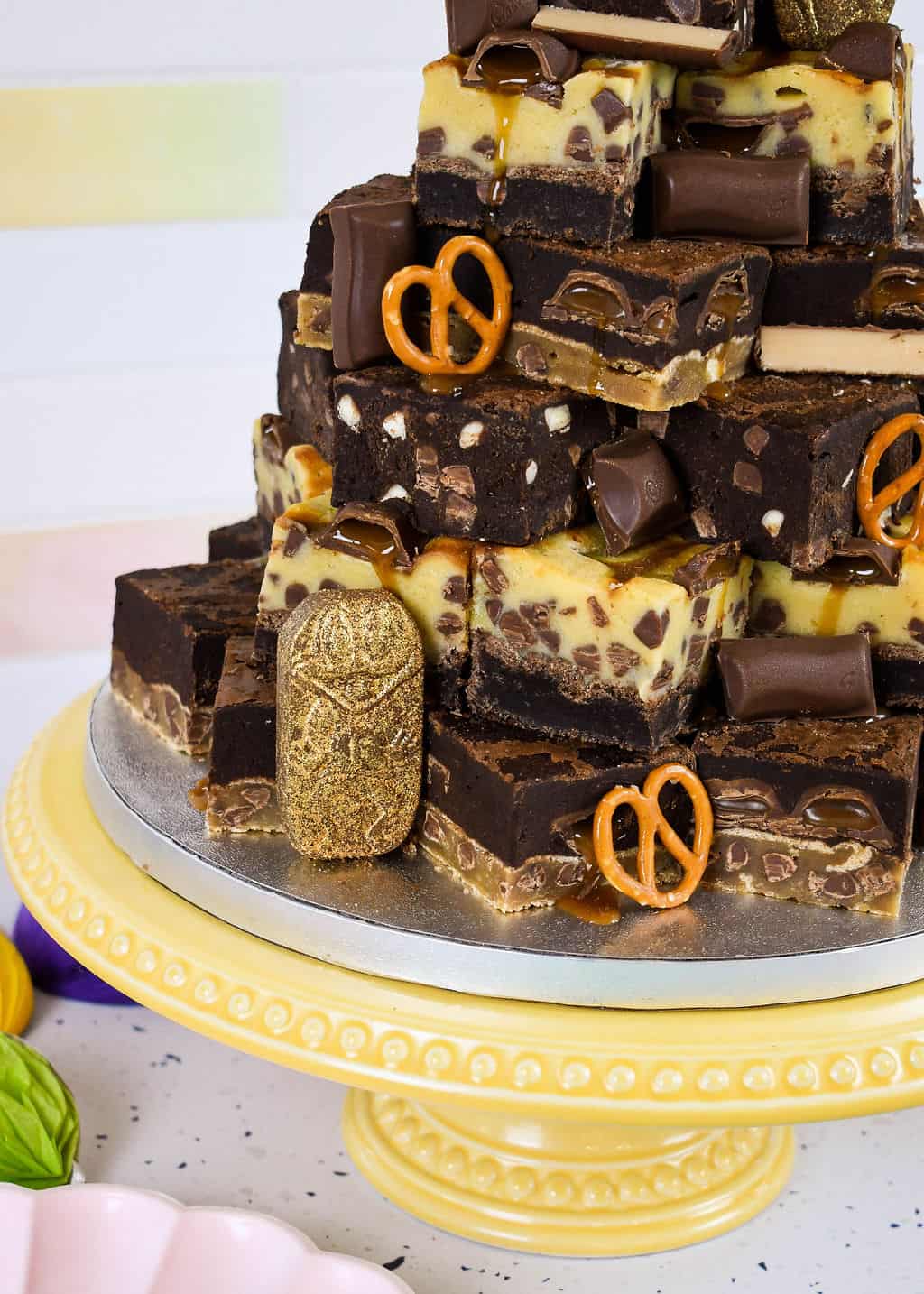 Layers of Caramel Brookie, Caramel Blockie and Triple chocolate brownie decorated with Caramel themed Chocolates