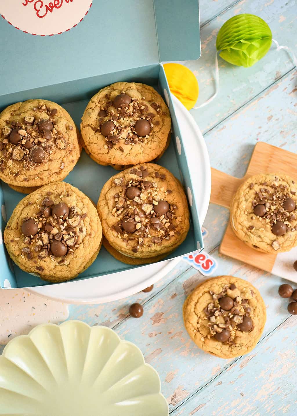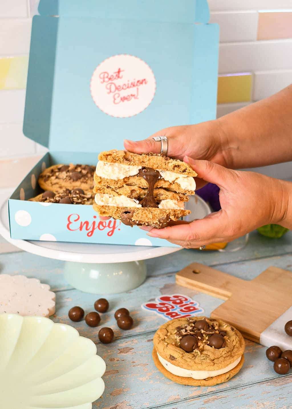 A Chocolate chip cookie sandwich with Malteser buttercream and milk chocolate filling topped with Maltesers.