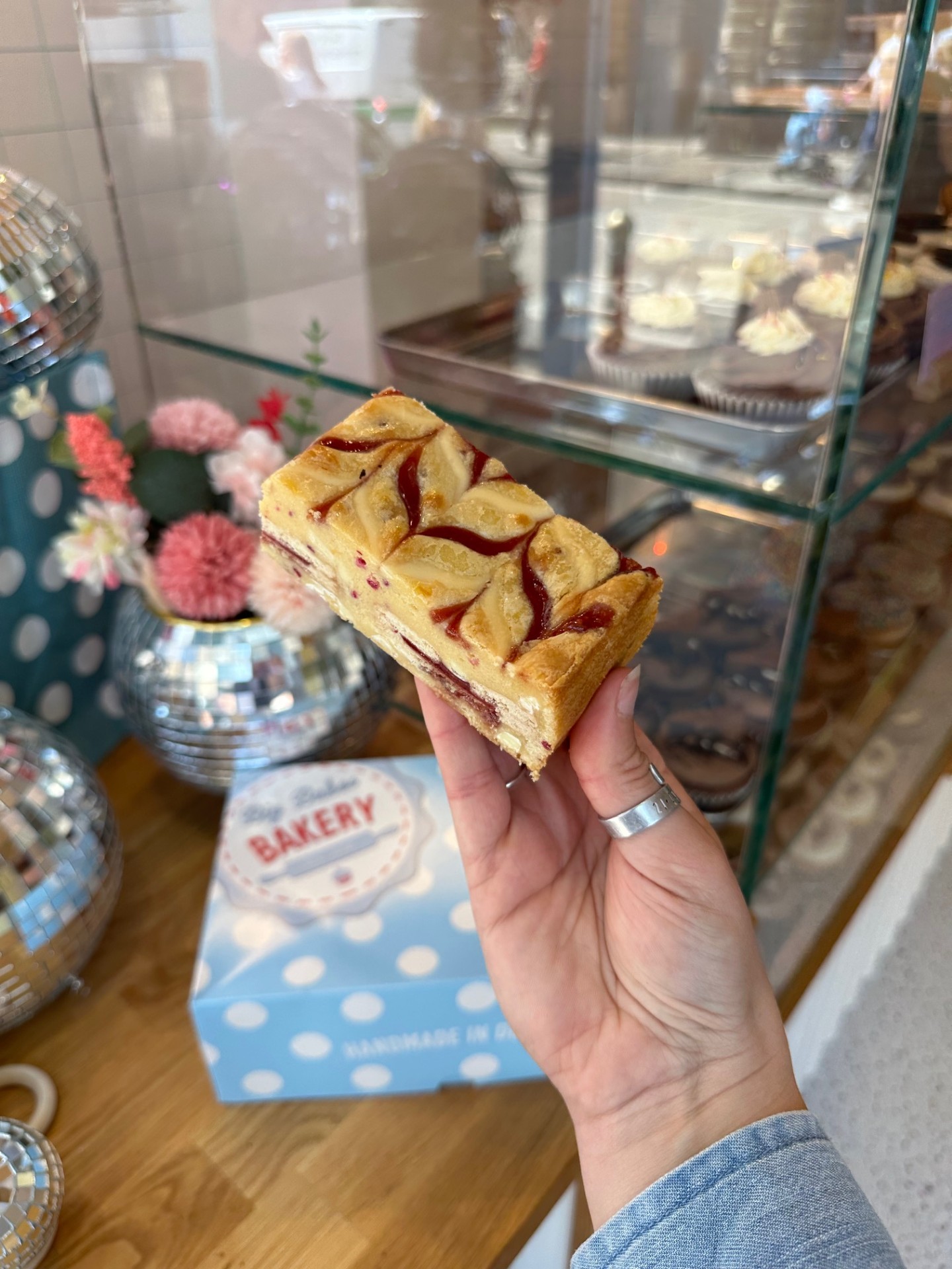 Our white chocolate blondie with white chocolate chunks, raspberry jam, raspberry pieces and jammy dodger biscuits inside. Topped with white chocolate and raspberry jam