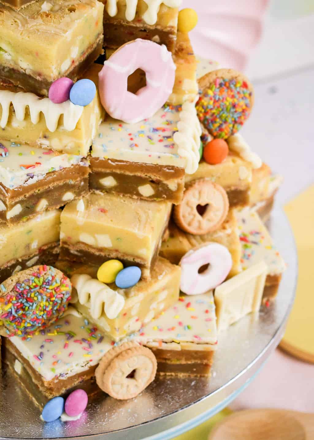 Layers of white chocolate and sprinkles blondie, white chocolate and sprinkles blockie and white chocolate and sprinkles millionaire’s cookie decorated with party themed biscuits.