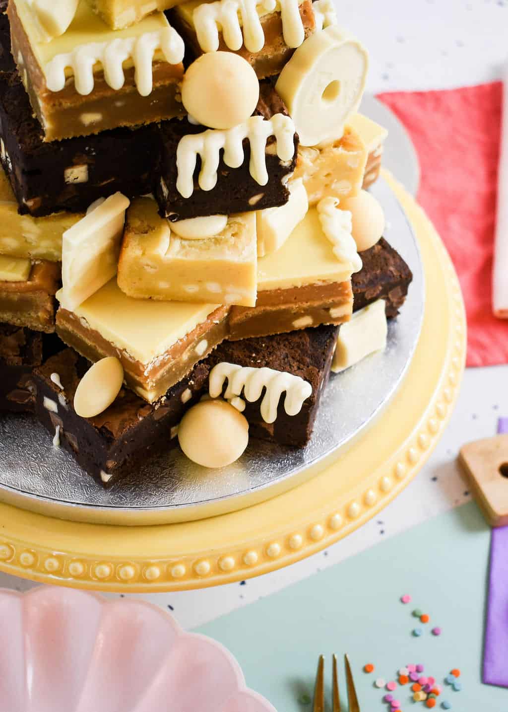 Layers of Triple chocolate brownie, White chocolate millionaires cookie and white chocolate blondie decorated with white chocolate drip and white chocolate pieces.